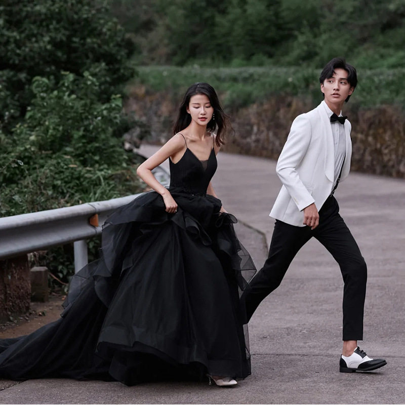 主题礼服2021展会新款影楼服装旅拍婚纱摄影外景拖尾黑色拍照热门设计联盟服务商